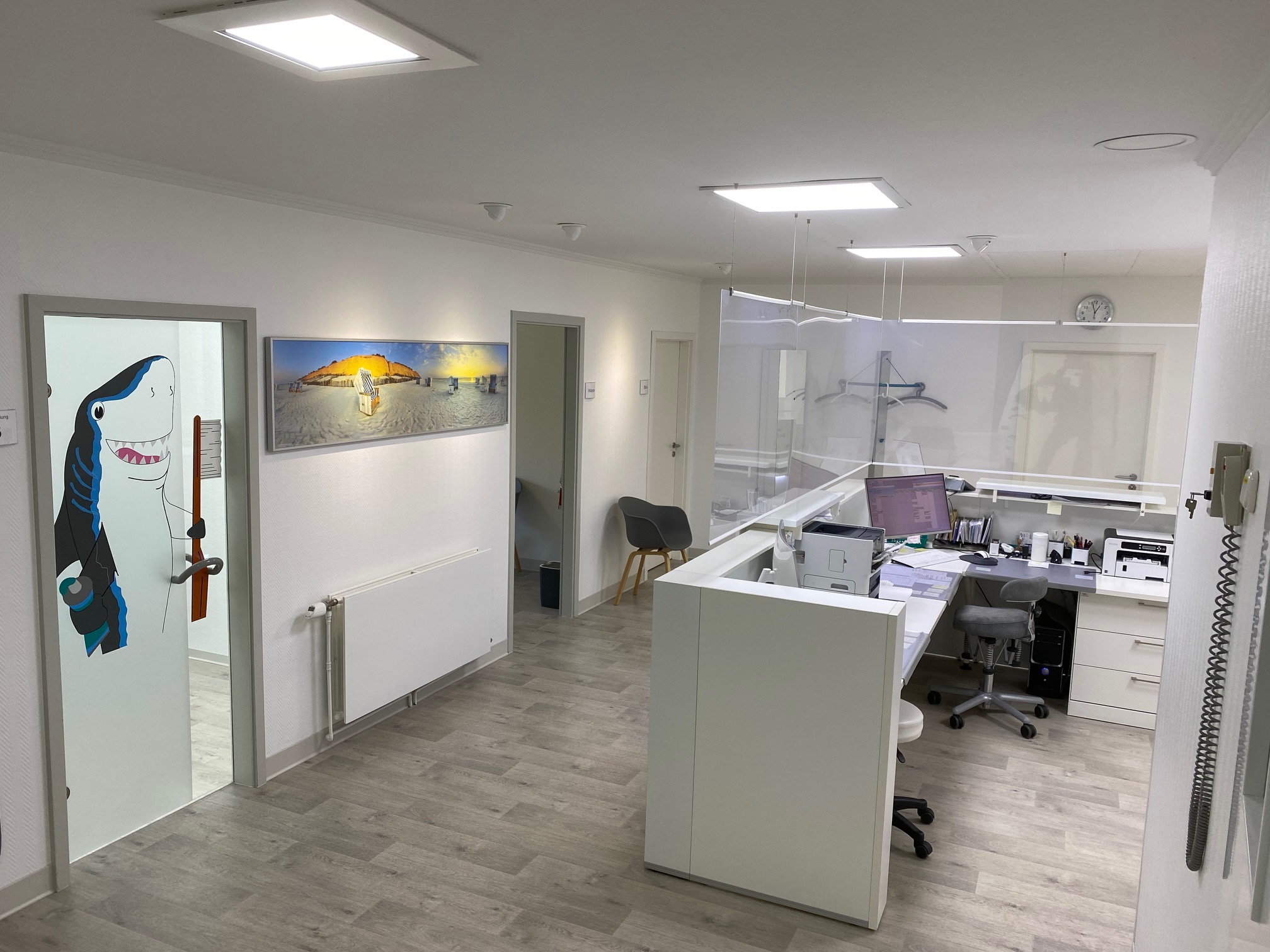 Auf ca. 150 qm Praxisfläche finden sie: 3 Bhz, Rezeption mit 2 Arbeitsplätzen, Steri nach den neuesten Regeln der Praxishygiene organisiert, digitales Röntgen und IOS, Sozialraum, Seminarraum und separates Büro. PVS Dampsoft, Netzwerk mit 6 Clients.